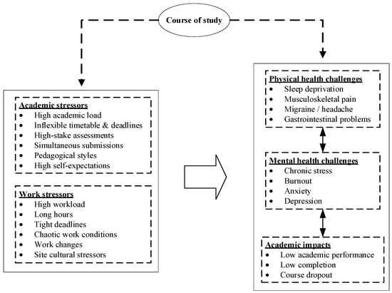 Many universities advocate for students to acquire hands-on industry experience alongside their studies, recognizing that it enhances employability by providing real-world insights and essential skills that complement university learning [,,,]. Despite these advantages, research signals a rising incidence of well-being concerns among university students, commonly associated with the challenges of balancing study and work commitments [,,,]. For instance, Zajac et al. [] found that around 15% of undergraduates leave university in the first year, which raises concerns about student retention. This dropout rate increases to 25% among undergraduate students in Australia []. These difficulties are not limited to a particular field but span various disciplines such as nursing, health, architecture, construction, engineering, agriculture, education, and environmental sciences [,,]. In the built environment sector, current research has pointed to various academic and work-related stressors that negatively affect students’ physical and mental health and academic progress, as discussed in the following sections.