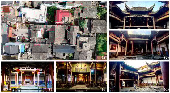 Photos of the Zhaomutang theater. (a) Aerial view; (b) stage; (c) front patio and corridor; (d) front patio; (e) Xiangtang; (f) rear patio and Qintang.