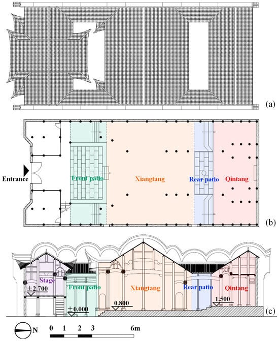 The Zhaomutang theater is in the middle of the old street of Yongshan Village, Yongshan Town, Leping City, Jiangxi Province, China. Its construction can be traced back to the Chongzhen period of the Ming Dynasty (1628–1644 AD), and it was renovated in the third year of the Guangxu period of the Qing Dynasty (1877 AD) and again in the 1990s []. As shown in Figure 1 and Figure 2, the overall floor plan of the theater is rectangular, incorporating multiple spaces—such as the gatehouse, stage, front patio, Xiangtang, rear patio, and Qintang—to form a typical “three-entry” sequence. The building gradually increases in elevation from the entrance to the Qintang, symbolically emphasizing the Qintang’s visual and ceremonial importance. Table 1 presents the basic dimensions of each subspace in the Zhaomutang theater.
