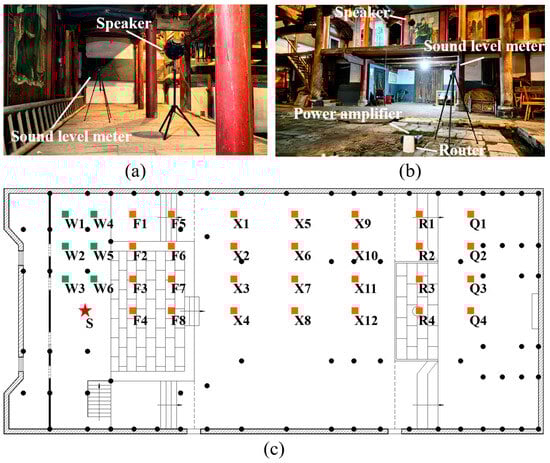 Figure 3 illustrates the measurement setup and the distribution of measurement points. The sound source (S) was placed at the center of the stage, and the microphone array was designed to capture the acoustic experience from both the stage area and the auditorium. Measurement points were distributed on the right side of the central axis, adhering to ISO 3382-1 symmetry guidelines. A total of six measurement points (W1–W6) were positioned on the stage to analyze how performers perceive their voices from different locations. In comparison, 28 measurement points (F1–F8, X1–X12, R1–R4, Q1–Q4) were distributed throughout the audience area to evaluate the effects of direct sound, early reflections, and coupled sound fields in each region. Because the front patio is large and relatively regular, microphone placement there accounted for both axial distance from the stage and lateral sound attenuation. Meanwhile, the Xiangtang displays more pronounced acoustic coupling with the patio, prompting a denser placement of microphones to capture detailed data on reflections and reverberation patterns. Although the rear patio and Qintang primarily serve ritual functions and occupy smaller areas, some measurement points were still arranged to represent their acoustic environments.