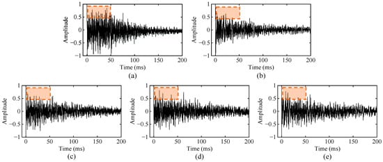 Pulse response within 200 ms at the stage and auditorium receiving points. (a) W2; (b) F3; (c) X7; (d) R3; (e) Q3.
