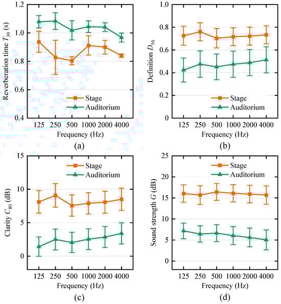 The sound quality parameters were calculated separately for the stage and auditorium and then subjected to statistical analysis across octave bands. Figure 5 shows the mean and standard deviation of the sound quality parameters at each measurement point. At mid-frequencies (500 Hz, 1000 Hz), the average reverberation time (T30) at the stage was approximately 0.86 s, while it was around 1.03s in the auditorium. Notably, the 125 Hz band exhibited a slight increase, aligning with the trend of stronger low-frequency reverberation commonly observed in southern courtyard-style theaters [,].