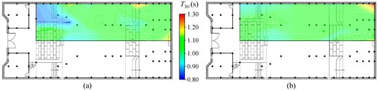 Auditorium T30 distribution map: (a) 500 Hz; (b) 1000 Hz.