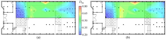 Auditorium D50 distribution map: (a) 500 Hz; (b) 1000 Hz.