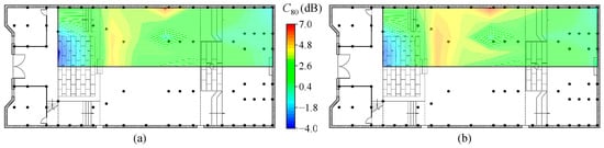 Auditorium C80 distribution map: (a) 500 Hz; (b) 1000 Hz.