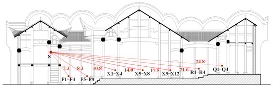 Notably, F5–F8 exhibit significantly higher G values than F1–F4, indicating a strong relationship between diffraction shielding and early reflections. As shown in Figure 10, the stage floor partly obstructs direct sound propagation to F1–F4, forcing diffraction to play a more prominent role and resulting in lower recorded levels than in F5–F8, which, though positioned farther away, benefit from improved reflected energy. Notably, the maximum distance between the sound source and measuring points reached 24.8 m. By elevating the terrain, the theater design effectively reduces the sound path length to the audience area and minimizes sound absorption by those seated in front. The Zhaomutang’s tiered profile design and overall elevation strategy ensure high-quality audio-visual experiences for back-row audiences while accommodating the theater’s multifunctional requirements.