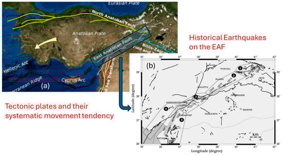 - Güvercin, S.E.; Karabulut, H.; Konca, A.Ö.; Doğan, U.; Ergintav, S. Active seismotectonics of the East Anatolian Fault. Geophys. J. Int. 2022, 230, 50–69. [Google Scholar] [CrossRef]