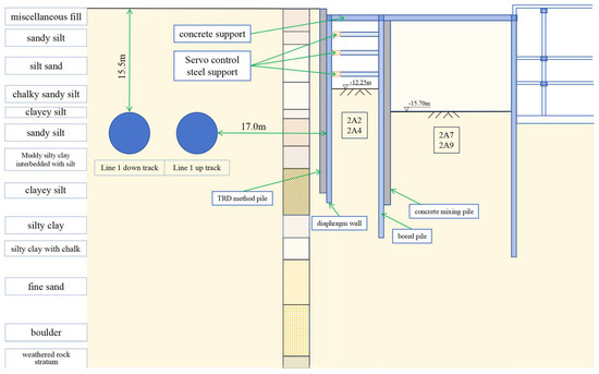 The specific partition numbers, excavation depth, and support structure are shown in Table 1. For Plot 4#, which is generally triangular, the aim is to minimize the impact on the subway tunnel and to the greatest extent control the deformation of the retaining structure. The foundation pit was subdivided into 12 smaller pits using the partition jumping excavation method. Since pit 2A11 is located outside the subway control protection zone, three concrete supports were adopted. Since the other pits are situated within the control protection zone, the first layer of these pits adopted concrete supports, while the second to fourth layers employed HSSS. On the south side of the underground two-layer pits, an 800 mm thick diaphragm wall was used, with a buried depth ranging from 26.0 m to 29.5 m. On the outer side, a 700 mm thick TRD was utilized for groove wall reinforcement and served as a waterproof curtain. On the inner side, triaxial cement mixing piles with a diameter of 850 mm were employed for groove wall reinforcement. Additionally, MJS construction piles were implemented to reinforce the water stop zones at the junction of the diaphragm wall and the drilled piles.