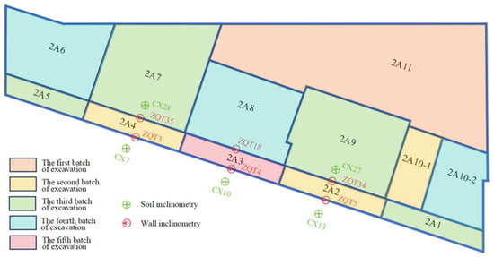 A large amount of scientific monitoring was conducted during the excavation process of this project’s foundation pit. All monitoring data was sourced from a third-party monitoring unit not involved in the construction. Monitoring was carried out daily in accordance with relevant monitoring standards and using calibrated equipment. This study primarily focused on the retaining structure of small foundation pits 2A2, 2A3, and 2A4, the deep displacement of the soil behind them, and the changes in the axial force of the internal support. Particular emphasis was placed on the horizontal displacement and axial force variations of the retaining structures under different excavation conditions. The distribution of monitoring points is illustrated in Figure 4.