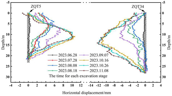 Pits 2A4 and 2A2 exhibited similar working conditions, with soil present on both sides during excavation. Monitoring status of foundation pit in zone 2A2 and 2A4 is shown in Figure 5 and Figure 6. ZQT3 and ZQT35 are the deformation curves of the retaining structure of pit 2A4, where the ZQT3 is near the subway side and the ZQT35 is far from the subway side. ZQT5 and ZQT34 are the deformation curves of the retaining structure of the pit 2A2, where the ZQT5 is near the subway side and the ZQT34 is far from the subway side. The excavation began on 28 June 2023, followed by the pouring of the bottom slab on 5 September 2023. Subsequently, the supports were systematically removed from bottom to top to facilitate the construction of the main structure and the gradual removal of the internal supports.