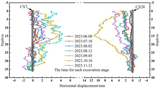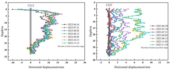 Figure 7 and Figure 8 illustrate the deformation of the soil outside the foundation pit retaining structure, where CX13 is outside ZQT5, while CX27 is outside ZQT34. A comparison revealed that, as the excavation progressed, the soil on both sides of the foundation pit exhibited a tendency to deform inward. The maximum displacements of the soil and retaining structure are listed in Table 3 and Table 4.