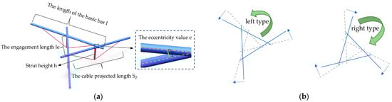 - Basic element direction. Fix the center of the basic element and increase the engagement length. If the contact point between the basic bars rotates counterclockwise, the basic element is referred to as the “left type”. If the contact point between the basic bars rotates clockwise, the basic element is referred to as the “right type”, as shown in Figure 4b.