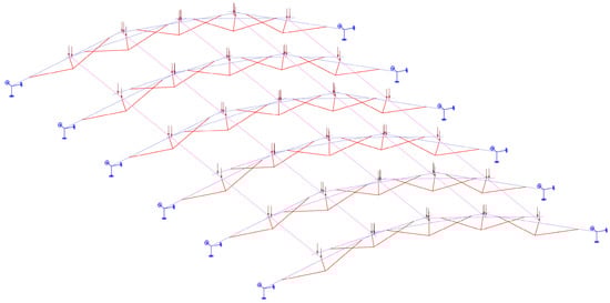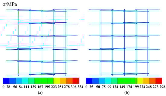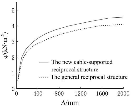- The maximum stress of the new cable-supported reciprocal structure exhibits symmetry under uniform load. Under the same load, the vertical displacement of this new structure is 17% smaller than that of the general reciprocal structure, and the overall stress is also reduced. As a result, the new cable-supported reciprocal structure can effectively improve the resistance to deformation of the members.
