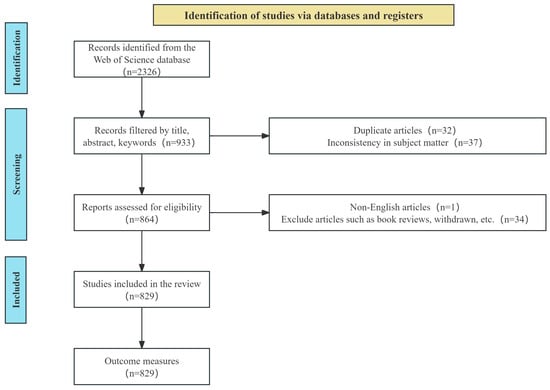 In the second step, this study strictly adhered to the standardized framework of the PRISMA statement (Preferred Reporting Items for Systematic Reviews and Meta-Analyses) and follows the process guidelines of PRISMA-ScR (an extension for Scoping Reviews) to ensure transparency and reproducibility in the literature-screening process. Given that this study aims to systematically map the knowledge evolution and structure of the interdisciplinary field of “machine learning + smart cities”, the scoping review method was employed to conduct a comprehensive scan of the existing literature, rather than focusing on specific intervention effects, as in a systematic review. Specifically, starting from the initial 2326 records retrieved from the WoS database, automated deduplication was performed using the EndNote X9 reference management software. Subsequently, two researchers independently conducted a double-blind screening of the titles and abstracts, excluding non-research studies, such as book reviews and conference announcements. Discrepancies were resolved through group discussions, resulting in a final analytical sample of 828 valid articles. The entire screening decision process was visualized using a PRISMA flow diagram (Figure 1), strictly following the PRISMA workflow, which includes three stages: Identification, screening, and inclusion, to enhance the systematicity and reliability of the study.