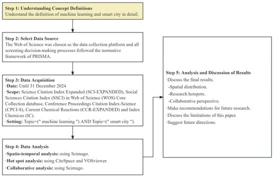 In summary, to comprehensively analyze the research status and trends of machine learning applications in smart cities, this study adopted a quantitative bibliometric analysis method, integrating tools, such as Scimago, CiteSpace, VOSviewer, and Bibliometrix, to conduct systematic research from multiple dimensions. The specific research process is illustrated in Figure 2. First, the time-slicing technique of Scimago was employed to observe the temporal evolution trends of research topics, and Bibliometrix was used to identify high-impact journals, authors, and institutions, thereby clarifying the core literature and foundational research in the field. Second, VOSviewer and CiteSpace were utilized for study clustering and a burst analysis to identify research frontiers and trend shifts at different stages. Third, Scimago was used to map collaboration networks among authors, institutions, and countries, analyzing academic collaboration patterns. Finally, the research results from various dimensions were synthesized to summarize the knowledge system of the field, predict future development trends, and explore emerging technological directions.