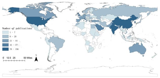 Figure 4 illustrates the global distribution of scientific research achievements related to machine learning and smart cities. The number of publications from each country is represented by varying shades of blue, with darker colors indicating a higher output of related research articles. As shown in Figure 3, China and the United States are the two countries with the highest number of publications globally, with the darkest colors, indicating their dominant positions in research on machine learning and smart cities. This dominance may stem from the long-term, large-scale funding support provided by the Chinese and U.S. governments for artificial intelligence (AI) and smart city research. For instance, the U.S. National Science Foundation (NSF) and China’s National Natural Science Foundation (NSFC) have established numerous specialized funding programs. Additionally, both countries possess world-leading cloud computing platforms (e.g., Alibaba Cloud, AWS) and smart city pilot projects, while many developing countries still lack high-performance computing centers, extensive data collection systems, and infrastructure such as smart transportation and power grids, which hinder related research. Furthermore, several European countries (e.g., Germany, the United Kingdom, France) also stand out, with darker shades indicating a high scientific output.