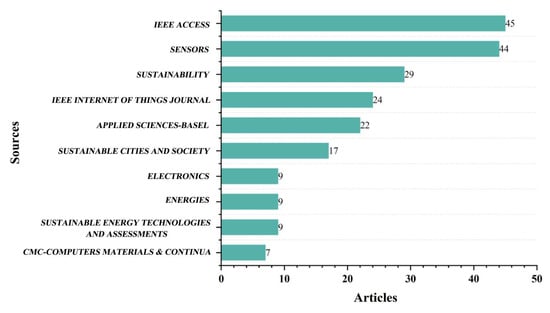 As shown in Figure 5, IEEE Access ranks first, with 45 publications, making it one of the most influential journals in this field, indicating its important position in research related to smart cities and machine learning [37]. Sensors follows closely, with 44 publications, demonstrating the significant role of sensor technology in smart cities, likely closely related to technologies such as the Internet of Things (IoT) [38]. The journal Sustainability has 29 publications, indicating that research in this field is closely linked to sustainable development, emphasizing that the construction of smart cities involves not only technology but also the sustainable use of the environment and resources [39]. The IEEE Internet of Things Journal (24 publications) [40] and Applied Sciences-Basel (22 publications) [41] show the broad connections between smart city construction and social and scientific applications, indicating a trend of multidisciplinary research. Sustainable Cities and Society also published 17 articles [42], underscoring the importance of the IoT in smart cities, with IoT technology being one of the core technologies of smart cities. Electronics (nine publications) [43], Energies (nine publications) [44], and Sustainable Energy Technologies and Assessments (nine publications) [45] reflect the applications of and research interest in electronics technology and energy systems in smart cities. Additionally, the publication volume of CMC-Computers, Materials & Continua (seven publications) [46] reflects the application of computer science and materials science in this field.
