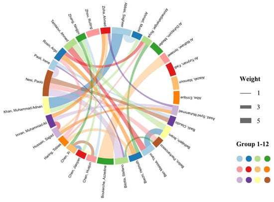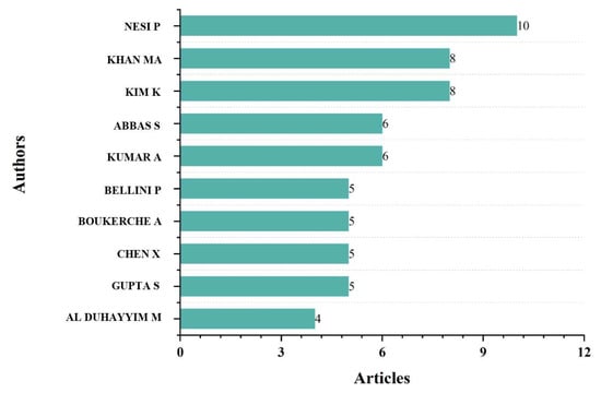 Figure 7 shows the top 10 authors with the most publications in the field of machine learning and smart cities, along with their specific number of publications. From the figure, it is evident that NESI P ranks first, with 10 articles. NESI P’s research mainly focuses on data management and optimization in smart cities, including the intelligentization of urban infrastructure, traffic flow optimization, and energy management based on machine learning [47,48,49]. His research outcomes have played an important role in enhancing the operational efficiency of smart cities and promoting sustainable urban development. Following closely are KHAN MA and KIM K, both of whom have published eight articles. KHAN MA mainly focuses on the development of intelligent systems in smart cities, such as intelligent transportation, environmental monitoring, and urban safety systems, aiming to enhance urban governance through deep learning and data analysis [50,51,52]. KIM K focuses on the integration of big data analysis and smart city applications, using machine learning techniques to optimize urban resource scheduling and improve the quality of public services [53]. ABBAS S and KUMAR A have each published six articles. ABBAS S primarily researches the application of the Internet of Things (IoT) and machine learning in smart cities, including smart sensor networks, real-time data processing, and urban monitoring systems [54,55,56,57]. KUMAR A has contributed to network security and privacy protection in smart cities, focusing on the application of machine learning methods to ensure data security and prevent network threats [58,59]. Additionally, BELLINI P [60], BOUKERCHE A [61], CHEN X [62], and GUPTA S [63] have each published five articles. Their research covers several key areas of smart cities, such as the optimization of intelligent transportation systems, urban health monitoring, large-scale data processing, and AI-driven urban service innovation.