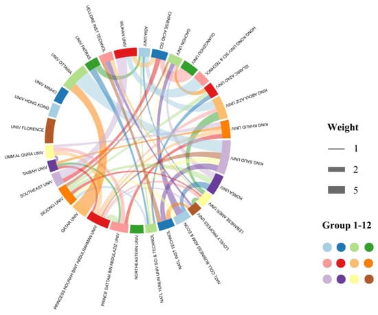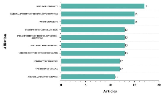 As shown in Figure 9, in terms of publication volume, King Saud University ranks first, with 17 publications. It is followed by the National Institute of Technology (NIT System) and Wuhan University, both with 15 publications each. The Egyptian Knowledge Bank (EKB), the Indian Institute of Technology System (IIT System), King Abdulaziz University, and the Vellore Institute of Technology (VIT) have each contributed 13 papers, demonstrating notable performance. Additionally, the University of Florence and the University of Ottawa are tied, with 12 publications each, while the Chinese Academy of Sciences follows closely, with 11 publications.