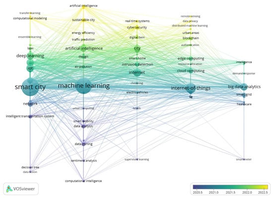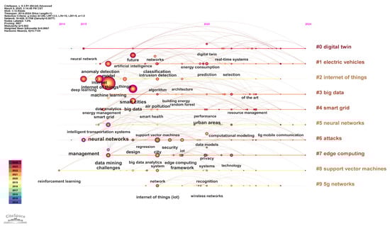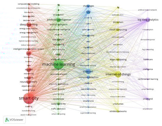 Figure 10 illustrates the clustering of keywords in the fields of machine learning and smart cities, reflecting the interconnections between different concepts and thematic focuses in the research. The red cluster revolves around “smart city” and is closely associated with keywords such as the IoT, neural network, deep learning, and intelligent transportation system. The research focuses on using technologies like deep learning and neural networks to optimize data processing, pattern recognition, and predictive analysis in smart cities [68,69]. It also involves applications such as traffic flow optimization, route planning, and smart parking to improve urban transportation efficiency [70]. The green cluster mainly focuses on artificial intelligence, data mining, and data analysis, and also involves keywords like renewable energy, sentiment analysis, and energy efficiency. Machine learning and data mining are widely applied in smart cities, including social media analysis, urban sentiment analysis, and energy optimization. The blue cluster involves keywords like cybersecurity, information security, digital twin, and challenges, reflecting that with the extensive application of IoT devices [71], information security and cybersecurity have become key research directions. This involves issues like data privacy and network attack defense, and it highlights the challenges faced in smart city construction, such as data privacy, infrastructure security, and social acceptance [72]. The yellow cluster revolves around internet-of-things, edge computing, wireless networks, and 5G, indicating that the high-speed, low-latency characteristics of 5G technology, combined with the local data processing capabilities of edge computing, provide more efficient computing and communication methods for smart cities. The purple cluster covers keywords like big data analytics, smart grid, reinforcement learning, and artificial neural network [73]. By optimizing energy consumption through machine learning, the efficiency of power systems can be enhanced, such as with smart meters and demand response.