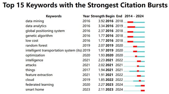 The year 2016 marked an important milestone, with keywords such as “data mining” (strength 3.92), “data analytics” (strength 3.34), “global positioning system” (strength 2.37), “genetic algorithm” (strength 1.77), and “low cost” (strength 1.77) emerging and forming bursts that lasted until 2018–2019. These keywords are closely related to research areas such as big data, machine learning, positioning technologies, and intelligent algorithms, reflecting the academic community’s strong focus on data mining, analytics, and low-cost optimization technologies at the time. From 2019 to 2020, the burst keywords “random forest” (strength 2.07), “intelligent transportation system (ITS)” (strength 1.97), and “optimization” (strength 1.93) indicated a shift in the research focus toward intelligent transportation systems and optimization algorithms. This trend reflects the widespread application of artificial intelligence and data-driven technologies in smart transportation, such as intelligent scheduling, route optimization, and autonomous driving. In 2021, the keywords “intelligence” (strength 2.23), “attacks” (strength 2.02), and “things” (strength 1.94) highlighted the growing attention to topics such as artificial intelligence, cybersecurity attacks, and the Internet of Things (IoT). This is likely linked to the rise of AI safety concerns and IoT security threats, reflecting the academic community’s emphasis on the security of intelligent systems. From 2022 to 2023, the keywords “feature extraction” (strength 1.91), “cloud” (strength 1.85), “federated learning” (strength 2.27), and “smart home” (strength 2.11) indicated a shift in research hotspots toward feature extraction, cloud computing, federated learning, and smart home technologies. Notably, federated learning emerged as a burst keyword in 2023 and continues into 2024, demonstrating increasing attention to privacy-preserving distributed machine learning techniques.