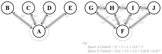 Figure 3 and Equation (1) illustrate the methods for calculating the control and integration. Table 2 summarizes the interpretation of space syntax expressions. Additionally, we used the depth map [41] program developed based on the space syntax to analyze the urban spatial hierarchy. Table 3 presents an interpretation of the key indicators applied in this study.