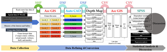 This study defines the crime rate in Busan as the frequency of crimes per unit area and employs space syntax to examine its correlation with the urban spatial hierarchy. The research process consists of crime and spatial data collection, data processing and conversion, and statistical analysis. Figure 4 outlines the study’s methodology.