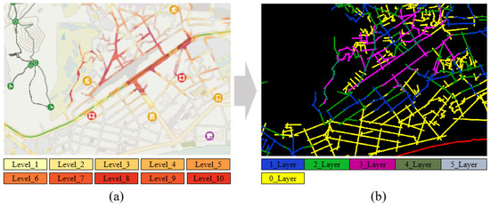 Second, the road centerline data of Busan were projected using the Korea 2000 Korea Central Belt 2010 coordinate system in ArcGIS (ArcMap 10.2). Overpasses, tunnels, and rail transport codes were removed from the attribute data filter before extracting the data as a DXF file. We created an axial map in AutoCAD (v2024) based on these road centerlines. While creating axial lines, we divided the 10-level crime hotspot legends on the Public Safety Map into five layers (layer 1: levels 1–2; layer 2: levels 3–4; layer 3: levels 5–6; layer 4: levels 7–8; and layer 5: levels 9–10). We created layers in AutoCAD according to these crime hotspot levels, and corresponding axial lines were generated for each layer. Additionally, we defined crime-free areas as level 0 to differentiate them from crime-prone layers. We then designed axial lines to follow the principles of optimal spatial straight-line paths. However, to ensure data consistency, if an axial line intersected a crime hotspot, the line was adjusted to secure the intersection and assigned to the corresponding crime hotspot layer (Figure 5).