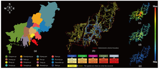 Several studies have also examined urban spatial hierarchy in Busan [27,28,29]. However, they have primarily focused on aging cities and cultural aspects. These include the location of elderly welfare facilities, museums, and potential evacuation routes for coastal disasters. Consequently, these studies differ from the present research, which explores the direct relationship between urban spatial structure and crime. Prior research has largely emphasized functional transformations in urban space rather than their direct influence on crime occurrence. This limits the ability to establish an empirical connection between urban spatial hierarchy and crime rates.