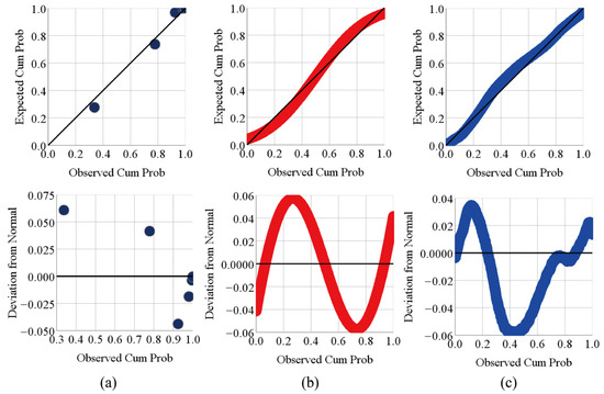 Normal and detrended normal P-P plot: (a) crime frequency, (b) control, (c) global integration.