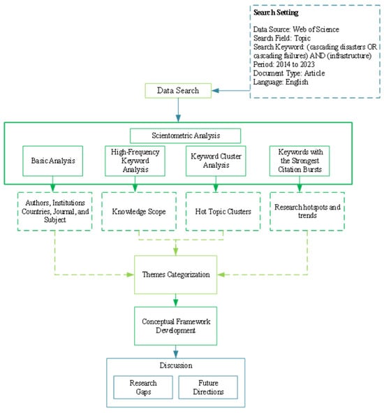 This study employed scientometrics methods to examine urban infrastructure cascading disaster research between 2014 and 2023. Scientometrics methods, categorized under science mapping, are an efficient technique for gathering an in-depth and comprehensive understanding of emerging research areas []. It helps provide a systematic and data-driven analysis of the research field by evaluating publications, citations, keywords, collaborations, and emerging topics using a set of quantitative techniques [,,,]. The research flowchart is depicted in Figure 1. It consists of five steps: (i) retrieving datasets through keyword searches and screening for relevant studies that match the research topic; (ii) applying scientometric techniques for quantitative analysis, including a basic analysis of co-authors, co-institutions, countries, and subject areas, as well as co-word analysis, cluster analysis, and keyword citation burst analysis; (iii) categorizing research themes within the field; (iv) proposing a thematic conceptual framework for research on urban infrastructure cascading disasters; and (v) discussing policy implications and future research directions.