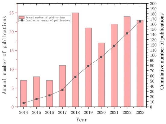 Figure 2 illustrates the evolution of publications, which can be divided into three phases. In the first phase (2014–2016), research in this domain began to emerge but remained relatively underexplored, with limited publications. In the second phase (2016–2018), there was a notable surge in research activity, reflecting scholars’ growing interest in exploring this field. In the third stage (2018–2023), research reached a mature stage, exhibiting minor fluctuations but maintaining a generally stable trend.