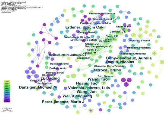 The co-occurrence of keywords is one of the most important analyses of science mapping that reveals the hot keywords and highlights the main research areas in the subject domain through time []. As presented in Figure 7, the author keyword was considered, and a network of 256 nodes and 1053 links was generated. The number of nodes indicates the number of keywords, while the links between keywords suggest that they have appeared in at least one article. The size of the keyword node reflects the frequency of its occurrence []. These high-frequency keywords represent the core content and research interests of authors in this field [].