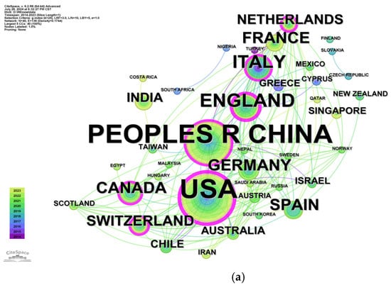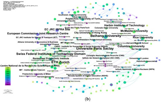 The number of articles published by countries and institutions is a key criterion for research authority in the field []. Table 3 lists the top 10 countries and organizations in terms of the number of articles. Figure 4 illustrates the collaborative network of countries and institutions. Among countries, the USA leads with 64 articles, accounting for 39% of the total, followed by China with 57 articles (35%). Other contributors include the UK (17 articles), Italy (15 articles), Canada, France, Germany, and Spain, each with 10 articles. Switzerland and the Netherlands follow with eight and seven articles. In terms of institutions, Universite Paris Saclay, ETH Zurich, and Beihang University tied for the lead with six articles each.