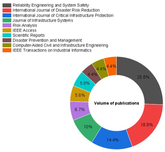Figure 5 ranks the leading journals in urban infrastructure cascading disaster research. Among these journals, Reliability Engineering and System Safety ranks first with 23 publications, accounting for 14% of the total. This journal mainly publishes research focused on analyzing the reliability of loaded systems and related content. For example, Xian et al. [] analyzed the damage inflicted by critical infrastructure systems during natural disasters, including cascading events, and modeled post-disaster recovery by considering the interdependencies of infrastructures. The rest of the top ten journals include International Journal of Disaster Risk Reduction (17 articles), International Journal of Critical Infrastructure Protection (13 articles), Journal of Infrastructure Systems (9 articles), Risk Analysis (6 articles), IEEE Access (5 articles), Scientific Reports (5 articles), Disaster Prevention and Management (4 articles), Computer-aided Civil and Infrastructural Engineering (4 articles), and IEEE Transactions on Industrial Informatics (4 articles). This reflects the interdisciplinary nature of the field, with publications emphasizing methods to protect, manage, maintain, enhance, and ensure the sustainability of critical infrastructure.