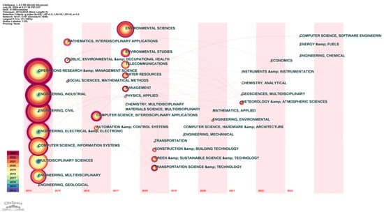 Subject categories are analyzed to present a temporal view of disciplinary focus in urban infrastructure cascading disaster research, as shown in Figure 6. The evolution of this research can be divided into three phases: Phase I, 2014–2016, is dominated by studies in engineering, electrical, computer, automation, and management field. For Phase II, 2017–2019, research expanded to environmental science, sustainable science and technology, transportation, and materials. For Phase III, 2020–2023, the focus shifted toward meteorology, earth sciences, economics, and interdisciplinary academic programs. The analysis underlines that the increasing multidisciplinary nature of urban infrastructure cascading disaster-related research. This field has evolved from addressing cascading failures in networked infrastructure systems to investigating various types of urban infrastructure failures and service disruptions triggered by natural disasters.