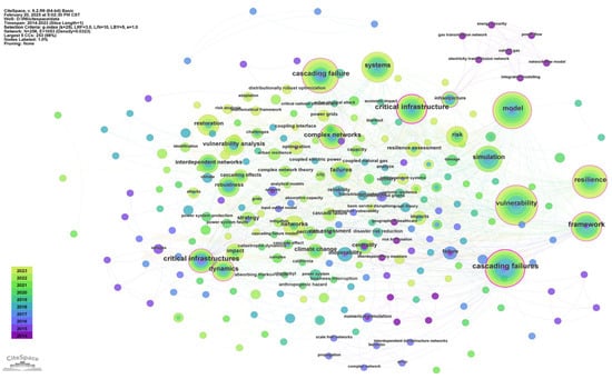 As presented in Table 4, the keyword “cascading failures” was identified 64 times across 165 papers. Its earliest occurrence dates back to 2014, peaking at eight instances in 2018. It represents the focus of this study. The second keyword is “vulnerability”, first appearing in 2014 and peaking in 2019. “Vulnerability” describes the susceptibility of urban infrastructure to damage during disasters []. Korkali et al. [] have analyzed coupled power communication network systems and concluded that higher coupling levels can reduce system vulnerability. Ranked third is “critical infrastructure”, which emerged in 2014 and gained attention in 2018. For example, Wu et al. [] modeled and analyzed cascading failures in interdependent infrastructures during a terrorist attack. The high-frequency keyword “modeling” has been an essential element in this research area since its first appearance in 2014. Although less prominent in 2015 and 2016, it has remained an integral part of research on urban infrastructure cascading disasters over the last decade. Furthermore, the keyword “resilience” describes the capacity of infrastructure to withstand, adapt, and recover from disasters []. “Systems” gained attention in 2018, particularly with the integration of systems thinking into research. “Frameworks” and “simulations” are vital for modeling urban infrastructure dependencies, simulating cascading disasters, and analyzing path propagation. These terms frequently co-occur with other high-frequency keywords. For instance, Goldbeck et al. [] utilized the words “simulation”, “framework”, and “vulnerability” to assess resilience in interconnected infrastructure via dynamic network flow modeling. Lastly, the keywords “complex network” and “dynamic” are widely employed to analyze how dynamic propagation mechanisms can result in behaviors like infrastructure collapse []. These keywords could help researchers understand the interdependencies and cascading failures in urban infrastructure systems.