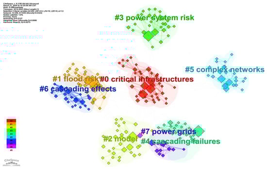 Keyword clustering analysis involves the grouping and clustering of keywords to pinpoint crucial research areas []. In this analysis, clusters were generated by using keywords from the documents, selecting “All in One” and “K” for “Source of Labels”, checking the similarity of clustered labels, and merging similar labels. For each cluster, the most encountered term is labeled as the name of the cluster. Figure 8 shows eight clusters labeled as #critical infrastructure, #flood risk, #modeling, #power system risk, #cascading failures, #complex networks, #cascading effects, and #grid, with each silhouette value exceeding 0.7, ensuring robust clustering. These eight clustering labels were then divided into four categories according to their nature, see Figure 9.