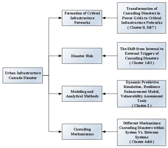 These clustering results highlight the dynamic evolution of concepts within this field of research. Initially, studies focused on individual infrastructure systems, where disasters and potentially destructive processes are considered cascading failures []. Over time, the focus shifted toward cascading failures of networked infrastructures such as water, gas, and distribution networks []. With increasing complexity in infrastructure systems, the interdependencies and vulnerabilities between these systems have driven the emergence of research into cascading effects and cascading disasters []. Although some ambiguity remains in understanding these two concepts [], some scholars have attempted to clarify their differences. Cascading effects characterize the dependencies and propagation of failures within and between systems. For instance, Codetta-Raiteri et al. [] examined cascading effects in power grids and described them as phenomena arising from systemic dependencies. In contrast, cascading disasters emphasize the evolution and destructive consequences of disaster events []. It often involves a series of domino effects resulting from natural disasters, human-made disasters, or internal system failures []. An example is the February 2021 freeze in Texas, which caused water shortages, frozen pipes, and power outages []. These evolving conceptual definitions reflect the ongoing maturation and development of research in cascading disasters.