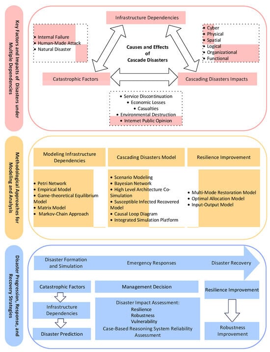 Based on the analysis results, a conceptual framework for research on urban infrastructure cascading disasters is illustrated in Figure 10. It consists of three parts: key factors and impacts of cascading disasters; methodological approaches for modeling and analysis; and disaster progression, response, and recovery strategies.