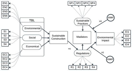 The purpose of this research is to evaluate the degree of correlation between the indicators and their respective constructs. In this case, the components are sustainable construction, sustainable practices, regulations, cost, and environmental impact. The primary intention of the research pertains to the indicators of SP and R. These indicators play a significant role in identifying policies, regulations, and practices that can be implemented in the real world to mitigate the environmental impacts caused by large-scale construction undertakings in developing nations. Ultimately, this research aims to develop a framework. Secondly, it explores the moderating influence of cost on the links between sustainable construction and regulation, regulations and the environment, and finally, between sustainable practices and the environment, as could be observed in the adopted conceptual model.