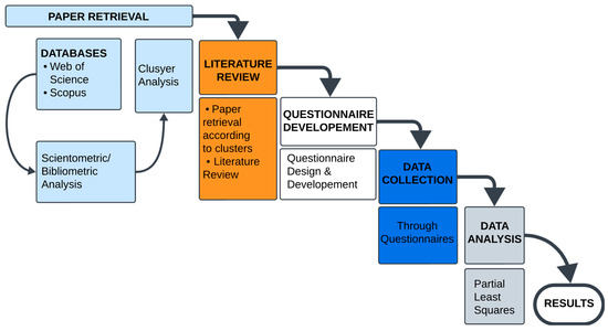 This study’s methodology involved retrieving papers, conducting a literature review, developing a questionnaire, gathering data, and analyzing them using the partial least squares method. These steps culminated in the acquisition of results, as depicted in Figure 2 of the research flow chart.