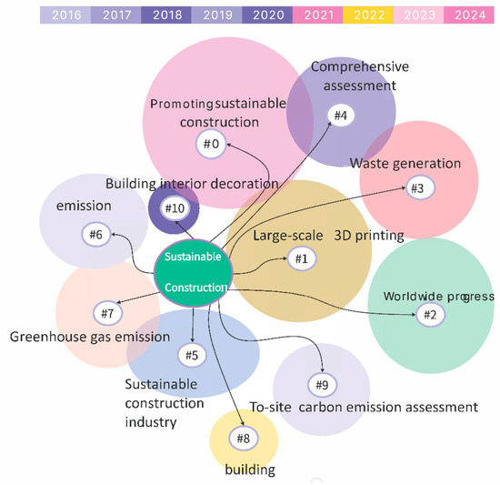 The study themes were visualized using bibliometric data and cluster analysis. CiteSpace grouped these keywords based on their co-occurrence [52]. CiteSpace automatically labeled derived clusters. It labeled terms from each cluster’s keywords. The top phrases are cluster-representative terms that occur with high frequency. The largest cluster is #0, the next largest is #1, and so on [46]. As a result, papers were retrieved from these clusters for the literature review, as shown in Table 1. Cluster #0 represents promoting sustainable construction; #1 represents large-scale 3D printing; #2 represents worldwide progress; #3 represents waste generation; #4 is for comprehensive assessment; #5 is for the sustainable construction industry; #6 is for emission; #7 is for greenhouse emission; #8 is for building; #9 represents on-site carbon emission assessment; and #10 is for building interior decoration.