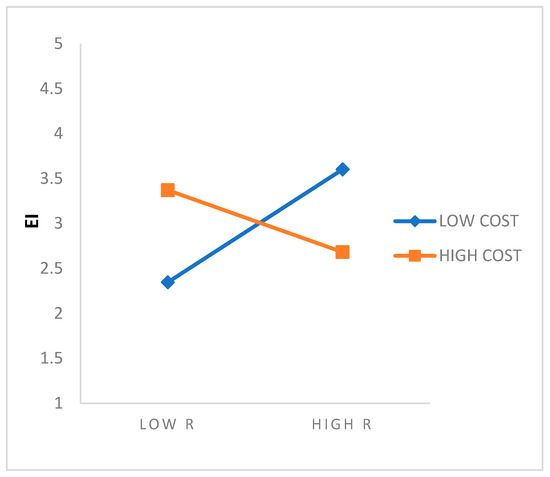 Cost weakens the link between regulations (R) and environmental impact (EI).