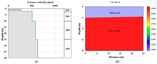 Geophysical studies are conducted to determine the elastic and dynamic parameters of the soil in the study area. A multi-channel analysis of surface waves (MASW) technique is used for S-type seismic velocity analysis. The method is based on the principle of analysing the Rayleigh-type surface waves present in the P-type field record by separating them into plane-wave components. The dispersion curve is determined from the phase velocity–frequency spectrum obtained as a result of the analysis, and an initial model is followed by iterative generation of the resulting S-type velocity–depth model. It is an effective way of obtaining shear wave calculations, which are an indicator of soil strength. The Vs30 value and the detection of thin layers can be calculated accurately with the MASW technique, one of the surface wave analysis methods. The Vs-Vp vertical velocity section and dynamic-elastic parameters of the soil are presented in Figure 2. Drilling and field studies are carried out for soil sampling and surface geological studies. In a total of 2 boreholes drilled to determine the type and stratigraphy of the soils in the study area, the distribution of soil properties according to depth is determined, as shown in Figure 2b; 0.00–2.00 m as fill and 2.00–20.00 m as dense clayey sand unit. In the drilling works carried out in the study area, a depth of 20 m is reached, and no groundwater is encountered. The test results on the samples taken from the borings drilled in the study area are presented in Table 1.