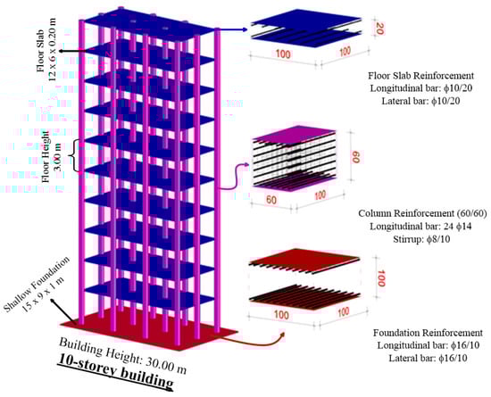 In this study, a 30 m high 10-storey reinforced concrete moment-resisting building model was selected to represent mid-rise buildings that can be frequently seen in cities. In order to increase the number of buildings exposed to the slope effect, three 4 m openings in the direction of the slope extension and two 3 m openings in the opposite direction were utilized. The openings and storey height in the modelled building are 3 m each. The building frame was planned using SAP 2000 V14 [15], in accordance with the relevant building standards, EN 1992-1-1 and EN 206-1 [16,17]. Gravity loads, including dead load 7.5 kPa (6 kPa for the weight of roofs and 1.5 kPa for the weight of partitions) and live load 2 kPa corresponding to residential buildings in accordance with the recommendations in Eurocode 1 [18], were considered at each floor. Since the ratio of the ultimate load (i.e., 122.91 MN) to the building gravity load (i.e., 20.6 MN), which is 5.97, is the ratio of the ultimate load that the building foundation can support according to Hansen’s method [19] and is considerably greater than the required minimum factor of safety (FOS) 3, it is understood that the designed foundation is suitable. The designed foundation and building were modelled in the IdeCAD V10 [20] program and analysed in accordance with IBC 2006 [10], and all necessary safety conditions were provided. A similar building model has been adopted in some studies on SSI analysis [21,22]. The model of the superstructures and the reinforcing bars per unit length of reinforced concrete elements are shown in Figure 3. Rust covers were calculated as 2.5 cm and 1.5 cm for columns and slabs, respectively. The material properties used in reinforced concrete elements are summarised in Table 2.