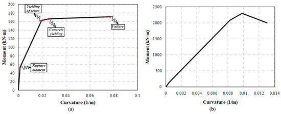The moment–curvature (M-κ) diagram of the reinforced concrete elements used in the simulations: (a) floor slabs; (b) columns.