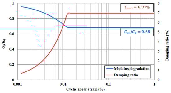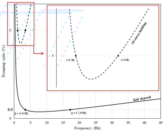 Soil exhibits hysteretic behaviour at small stresses and plastic behaviour at large stresses. It is important to define this behaviour of the soil in order to predict the seismic response of the system exactly. Therefore, a hardening soil small (HSsmall) model [30] is adopted in the present study. The HSsmall model can accurately simulate the depth-varying strength of the soil deposit and the hysteretic behaviour of the clayey sand [31]. Figure 6 exhibits the damping ratio curve and the normalized tangent shear modulus reduction curve for the soil deposit at the small strain range (10−3% ≤ γc ≤ 100%). To determine the soil–structure interaction effects, it is necessary to identify the natural vibration frequencies of the soil and superstructure [32]. In this context, soil natural vibration frequencies are also determined in the current study. The Rayleigh method was used to estimate the soil damping, as in the case of superstructure damping. Whereas Rayleigh damping is frequency dependent in the superstructure, it is almost frequency independent in the soil [33]. Therefore, the ξ has been assumed to be 0.5% in this study. The first and second natural vibration frequencies of the soil were calculated as 3.44 Hz and 17.19 Hz, respectively, with the second natural vibration frequency being 5 times the first natural vibration frequency, in accordance with previous studies on SSI analysis [11,34]. The change of damping ratio with frequency for the soil deposit is shown in Figure 5. It can be seen in Figure 5 that the critical frequency range obtained for the soil deposit is wider than the critical frequency range obtained for the structures.