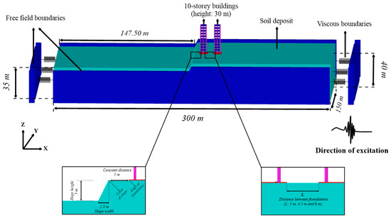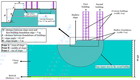 The cross-section of the structure–soil–structure system in the presence of the slope adopted in this study.