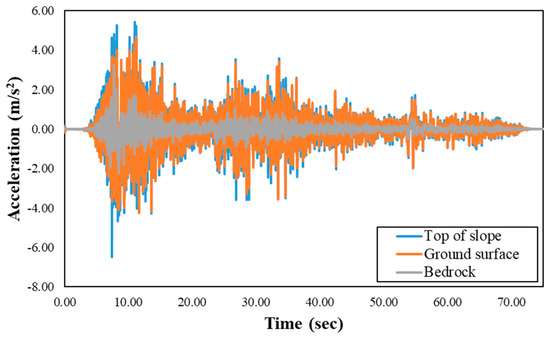 Time history of horizontal acceleration at bedrock, ground surface, and slope crest.